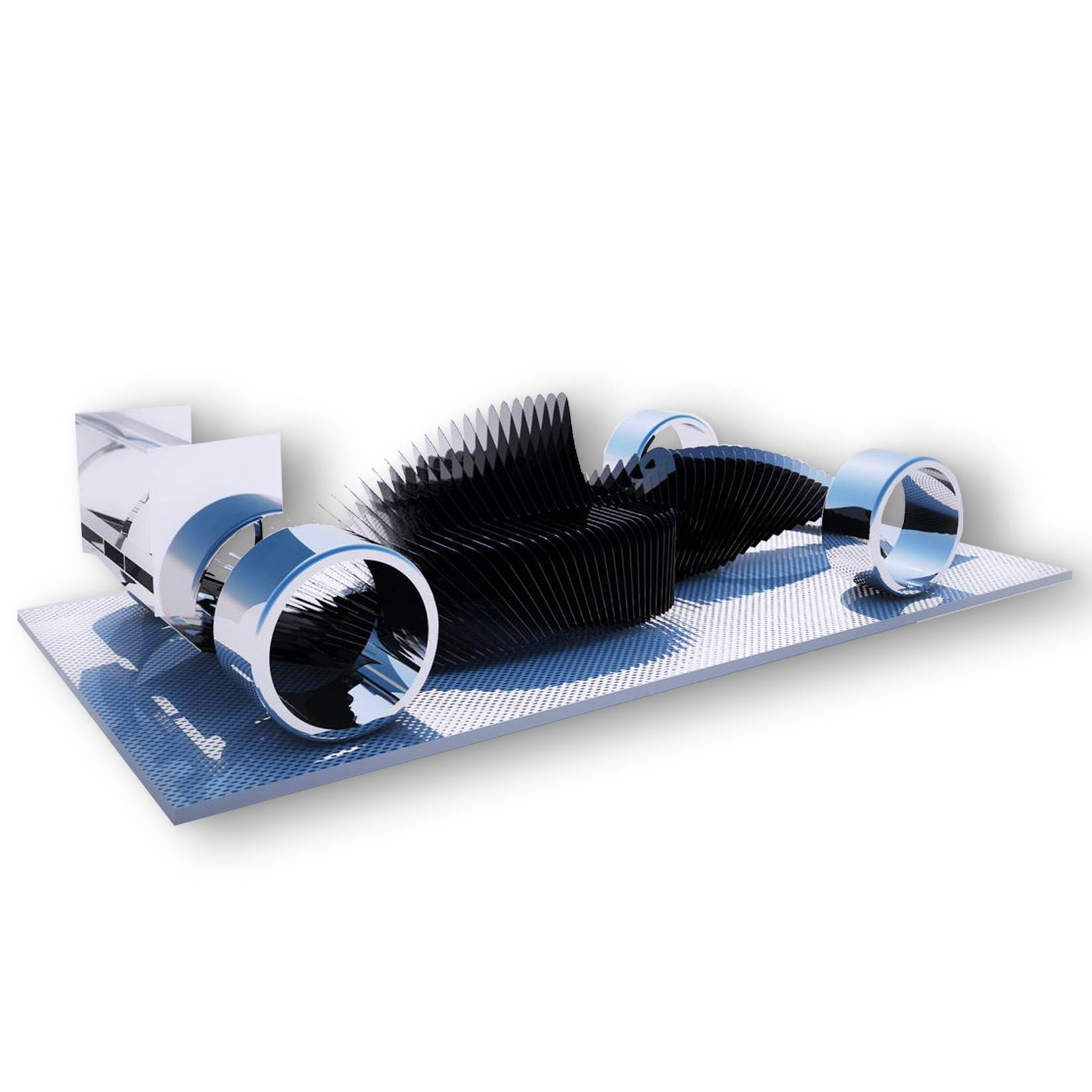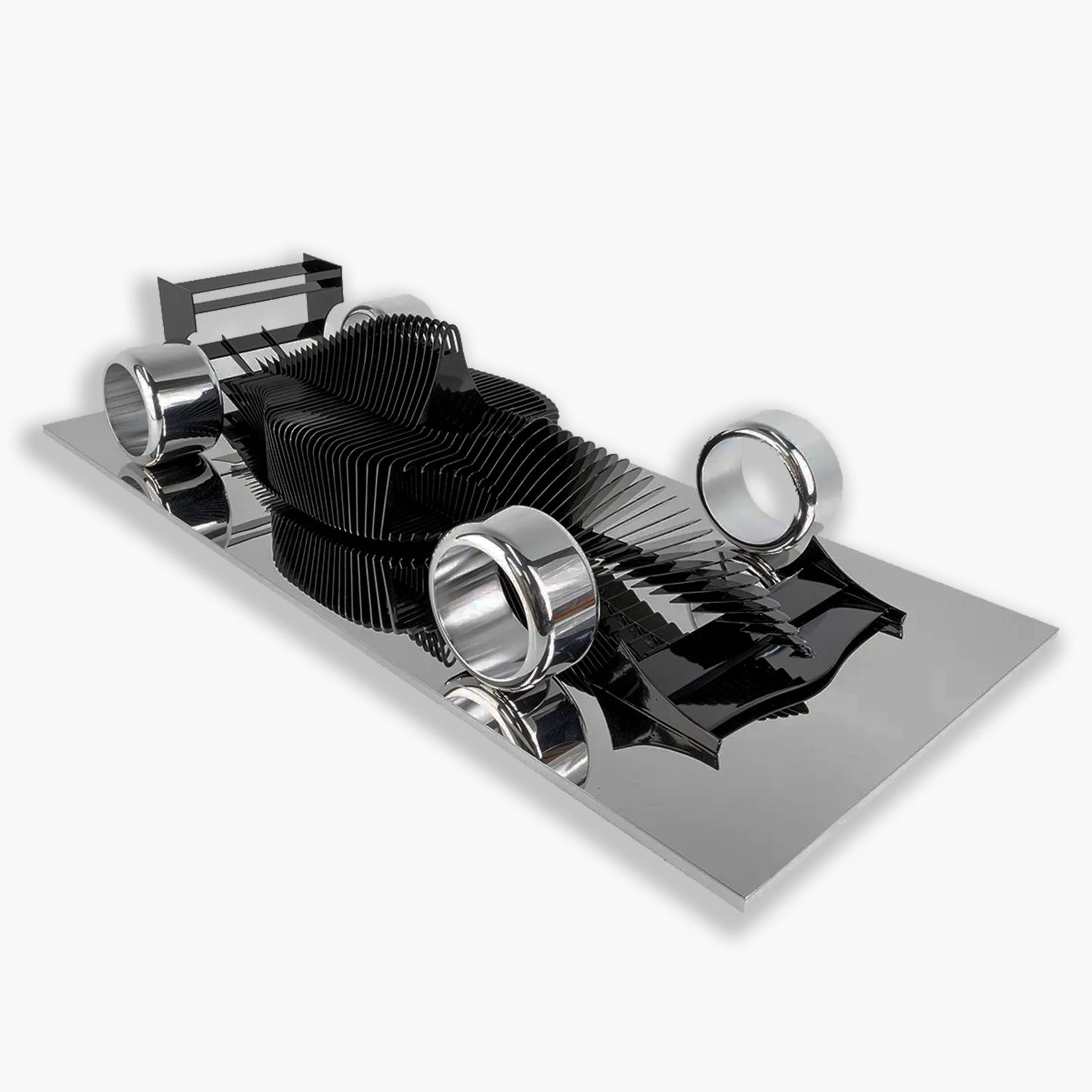 Son travail consiste à exposer une alternance de plein et de vide, matérialisant un squelette, décomposant les formes en strates successives. Un mouvement est créé par cette représentation séquencée. C’est donc une vision cinétique d’un objet statique que nous offre l’artiste, notamment grâce à la déambulation de son observateur, qui permet une interprétation différente en fonction de son point d’observation. L’effet dynamique est accentué par une alternance de symétries et d’asymétries, provoquant un effet d’accélération ou de décélération.